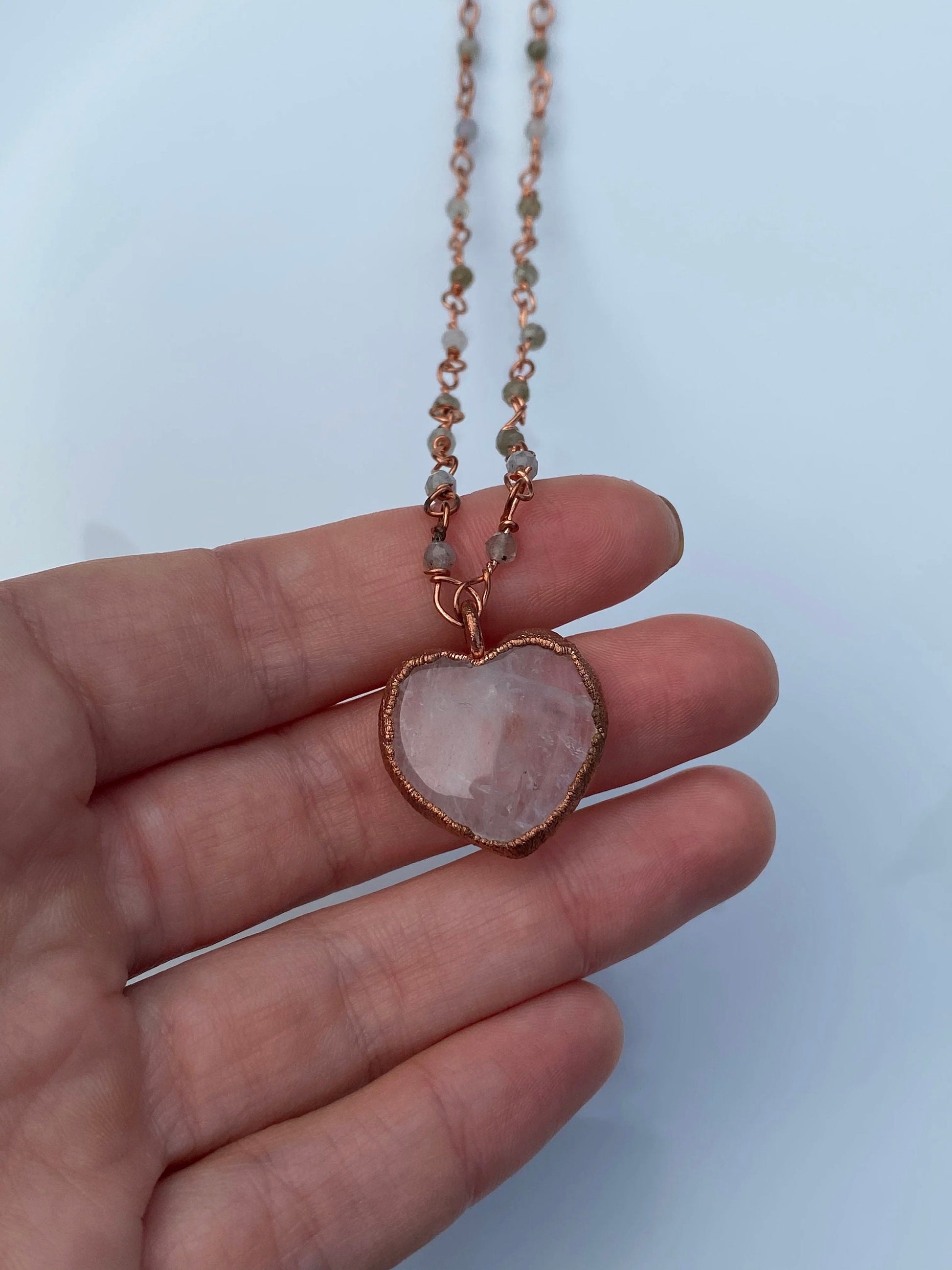 This handcrafted copper pendant, created in a singular piece, introduces a new dimension to artisan jewelry. Its exquisite appeal is derived from the natural beauty of quartz and labradorite.