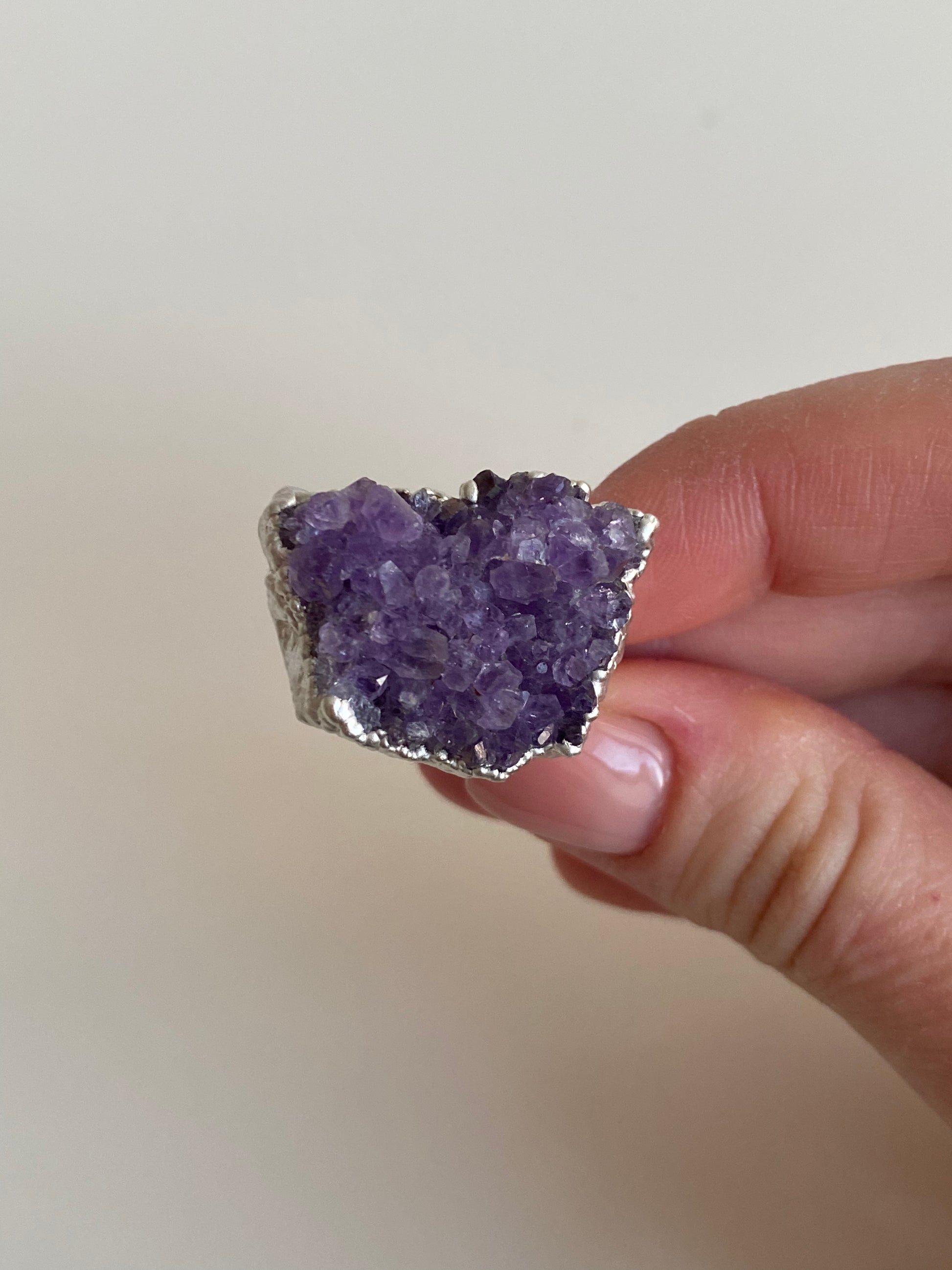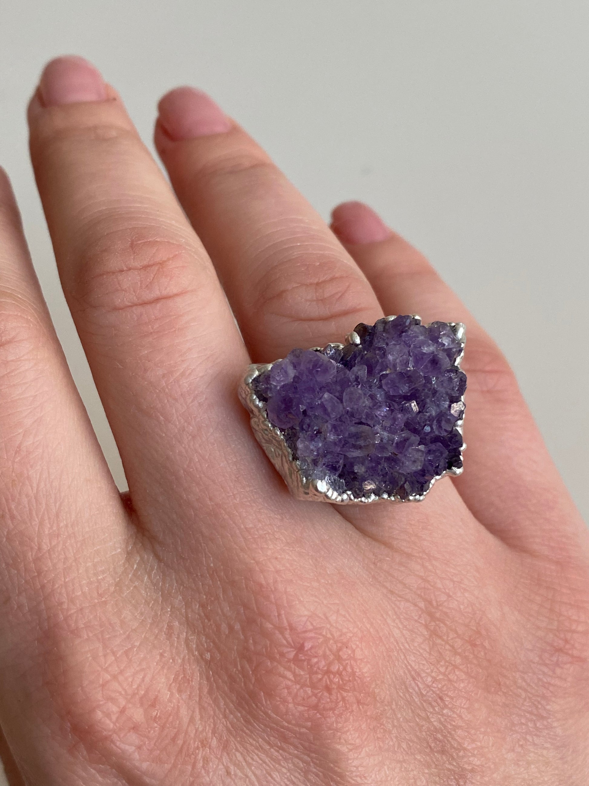 The material is natural amethyst druzy, covered with a layer of copper and big layer of silver.