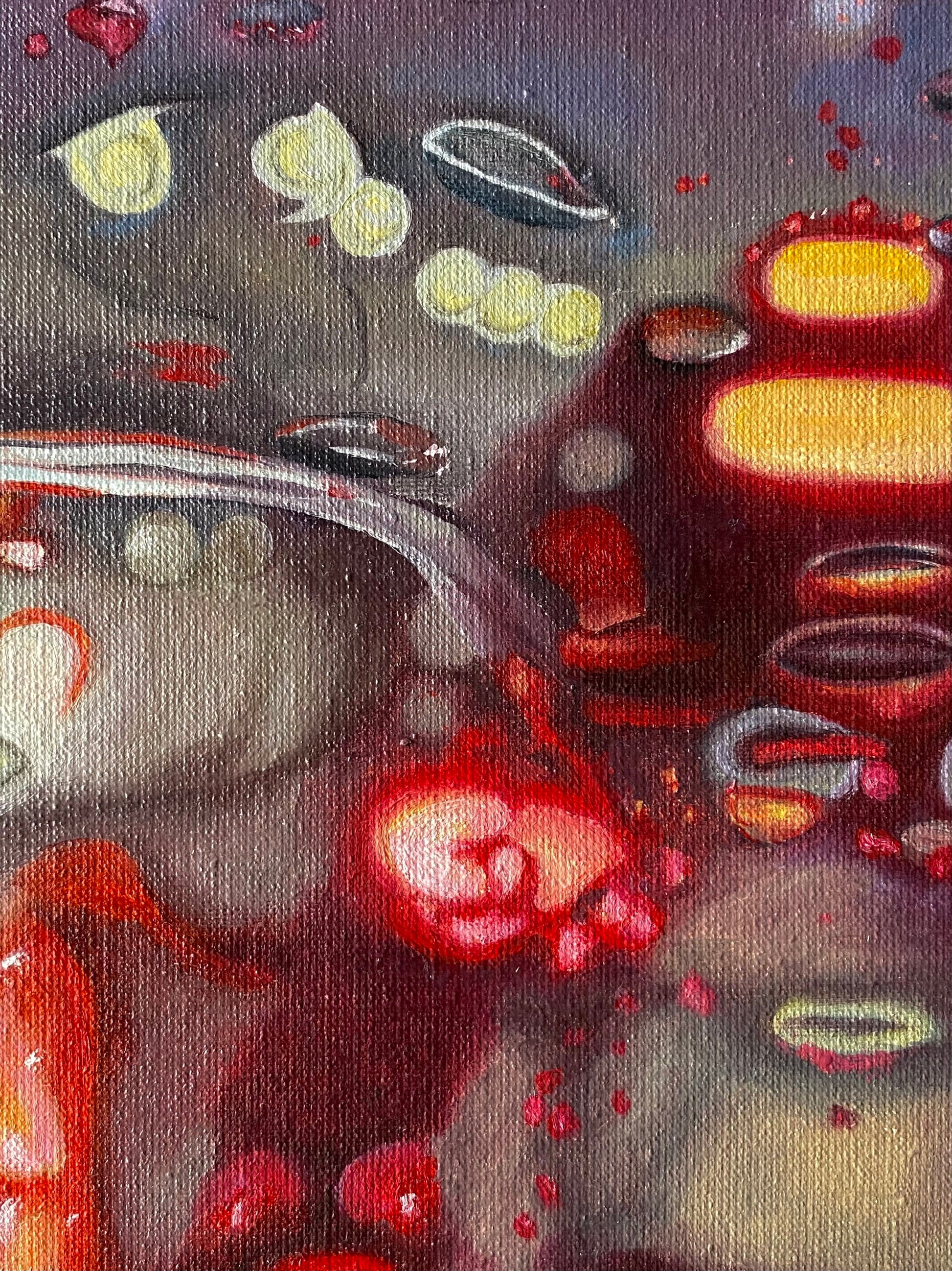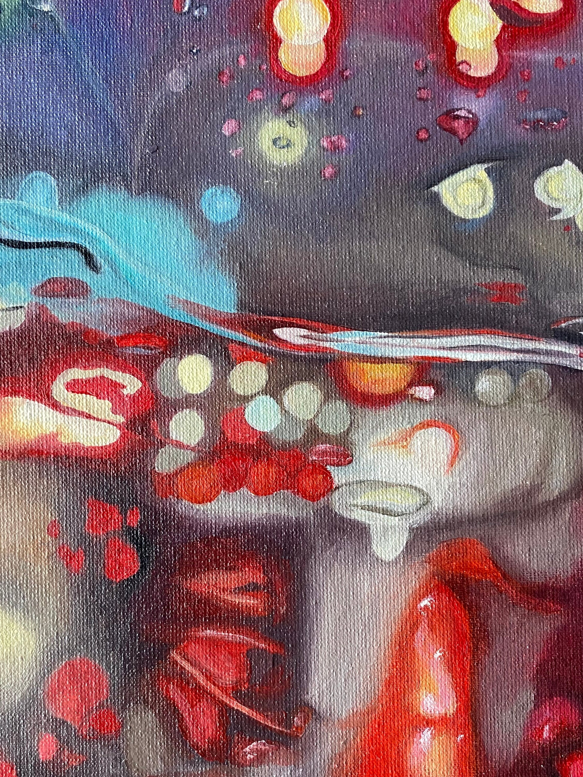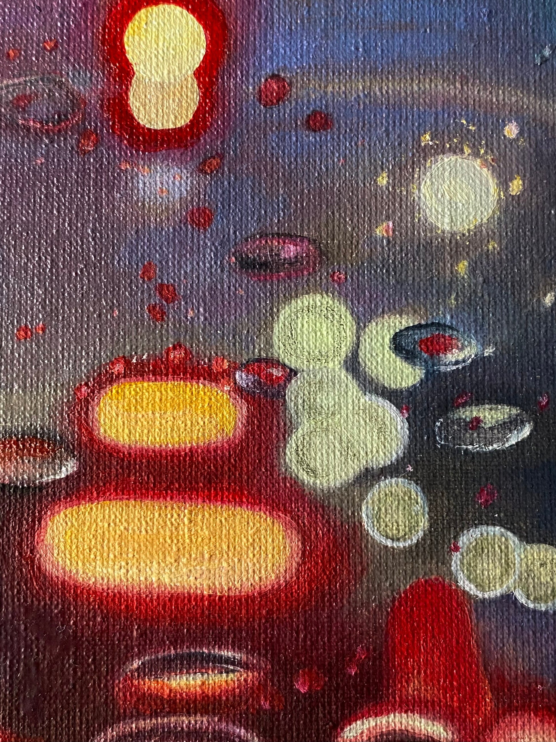 Round photorealistic oil painting, drops on glass, rainy street painting