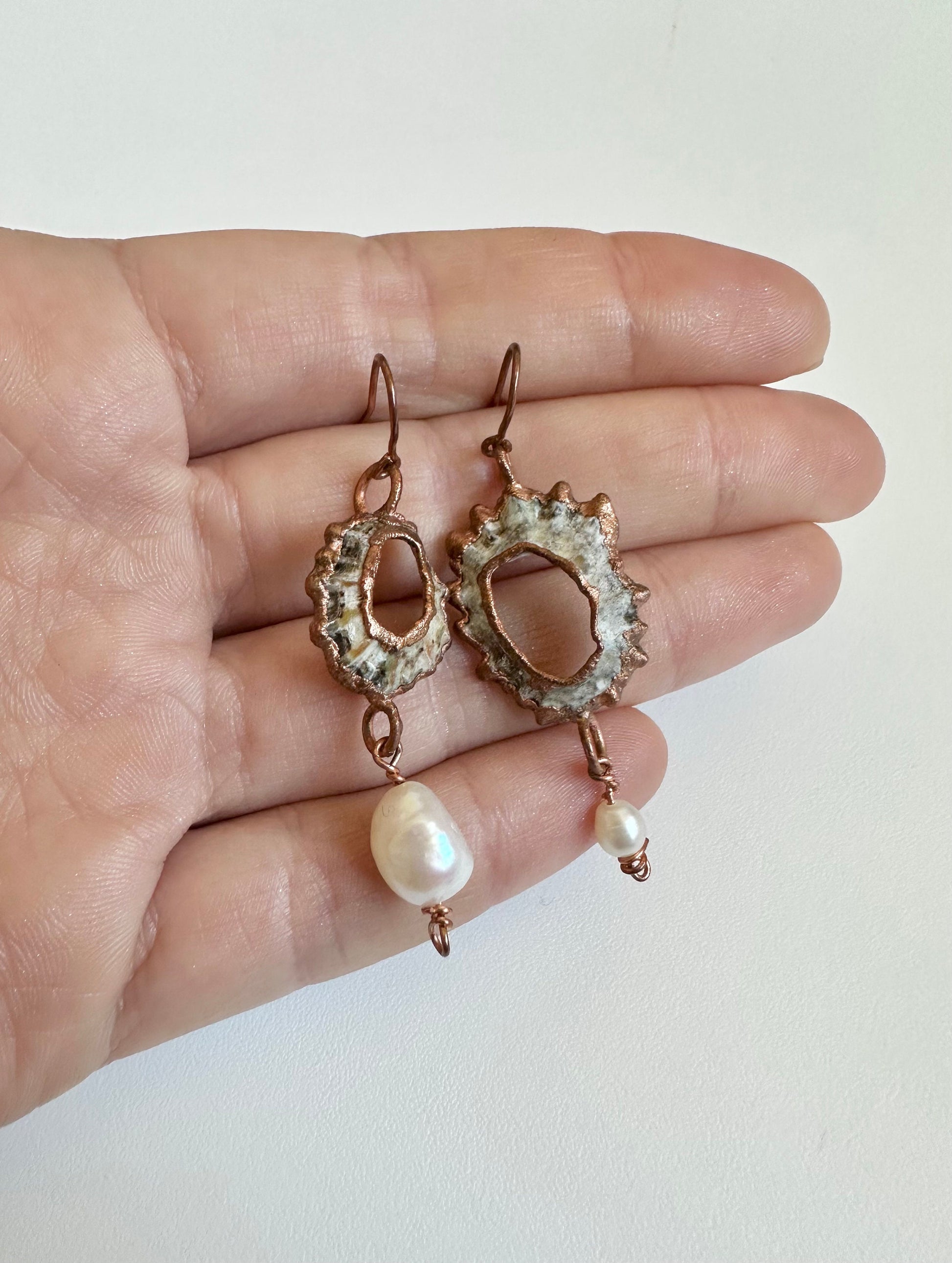 Shell Earnings, Handcrafted Copper Earrings, Pearl Earrings