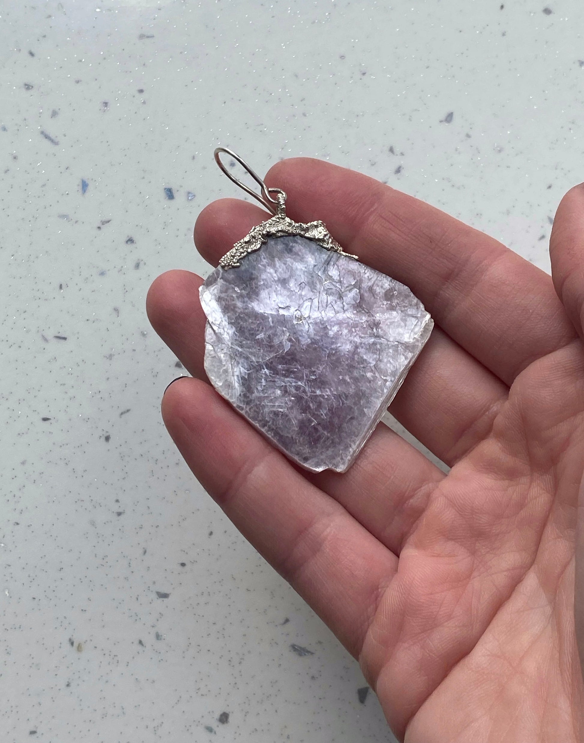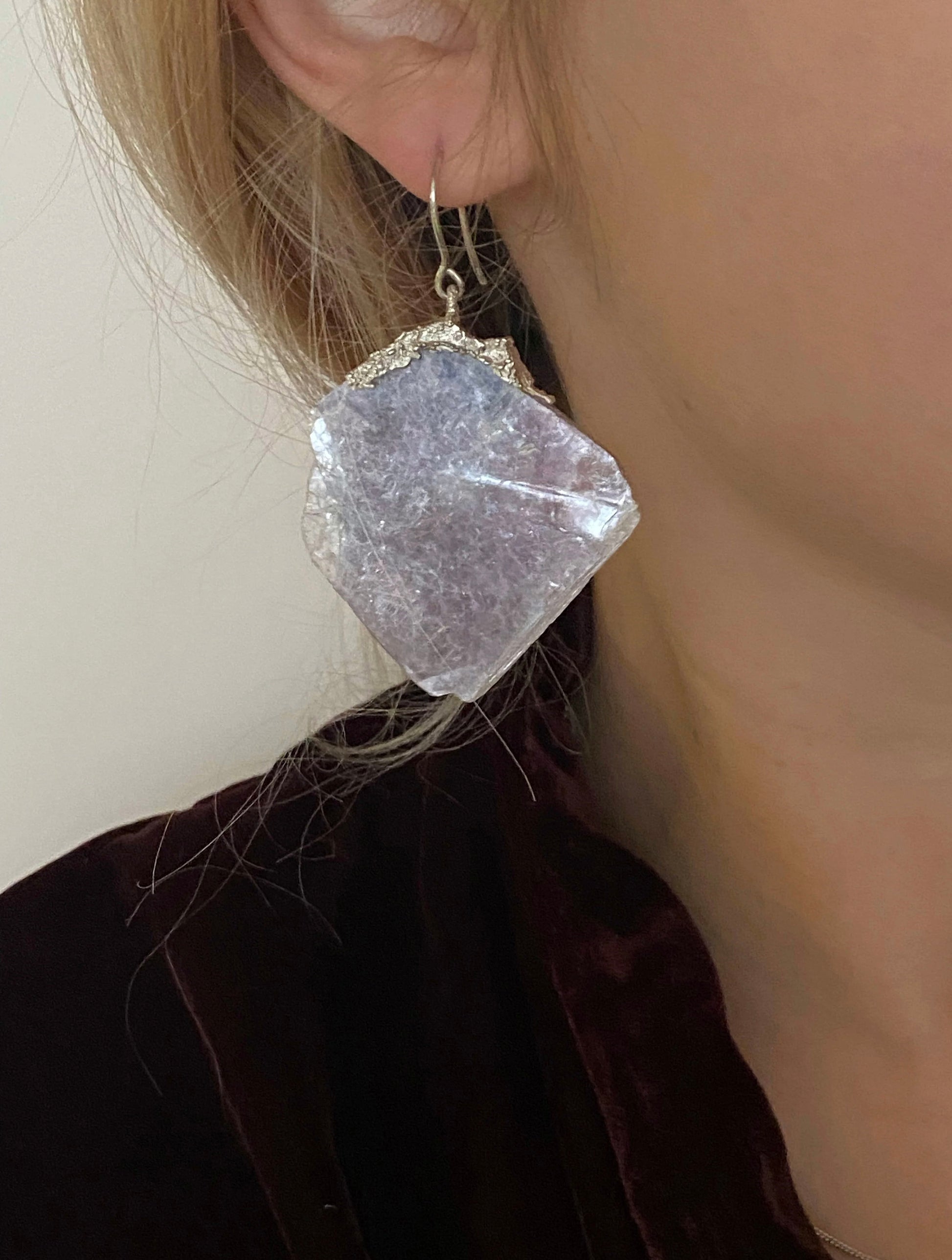 Embrace the uniqueness with these Silver Mono Mica Earrings, a one-of-a-kind piece designed for art enthusiasts. Crafted with natural mica, coated with layers of copper and a substantial silver overlay. Mica is known for its mystical properties, believed to enhance clarity and intuition. This exclusive earring, a solo statement in fashion, introduces a fashionable asymmetry to your style. Elevate your look with a touch of artistic elegance.